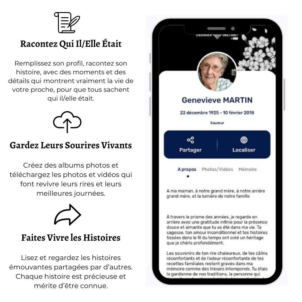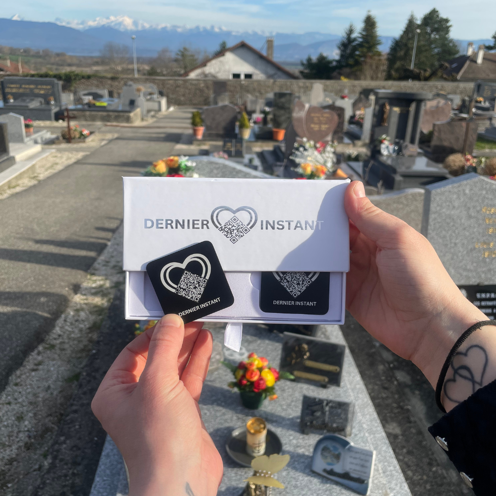 La plaque commémorative Dernier Instant vous permet de garder vivants les souvenirs de ceux qui vous sont chers. En un simple scan, vous pouvez afficher un profil personnalisé, comprenant des photos, des vidéos, une biographie, et bien plus encore. Ce dispositif innovant assure que la mémoire de vos proches reste toujours à portée de main, prête à être partagée avec votre famille et vos amis. Profitez de cette solution discrète et élégante pour honorer et commémorer les vies de vos êtres chers de manière moderne et intemporelle.